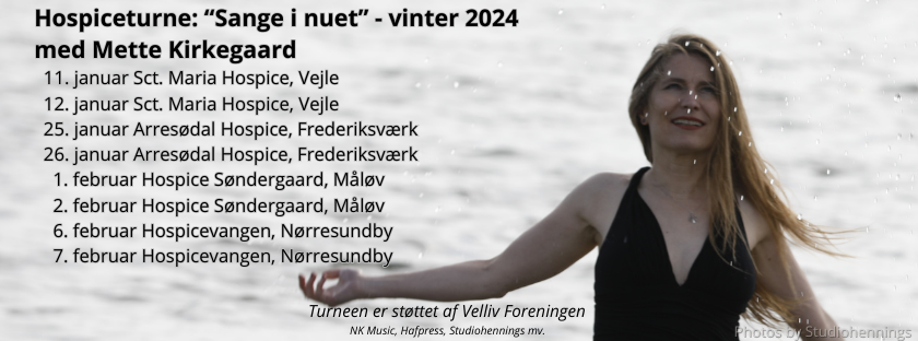På mandag den 14. nov. optræder jeg på Hospice Sjælland i Roskilde – på fredag den 18. nov. på Arresødal Hospice i Frederiksværk. Jeg glæder mig! Koncert: Mette Kirkegaard solo med naturlyden som ledsager og en sang i nuet
