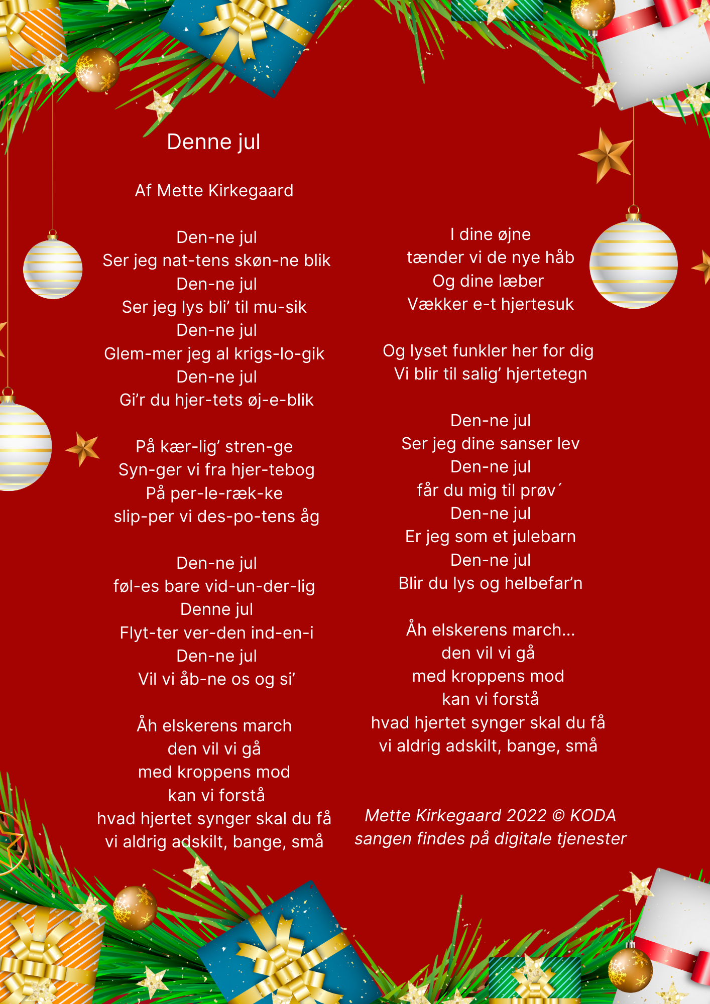 Julen er hjerternes fest. Det gør det stadig mere svært at forstå krigens logik i denne tid. Sangen er en opfordring til lyttere om at holde hjertet åbent i en kold tid: Lad os blive på lysets vej.